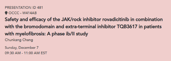 [1] Chang Chunkang,et al.Safety and efficacy of the JAK/rock inhibitor Rovadicitinib in combination with the bromodomain and extra-terminal inhibitor TQB3617 in patients with myelofibrosis: A phase Ib/II study.ASH 2025.