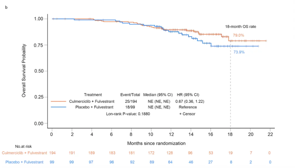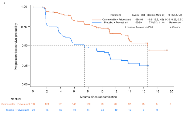 2022年3月18日至2023年3月3日期间,共293例患者符合条件入组。入组患者的中位年龄为53岁,既往均接受过内分泌治疗,23.3%因复发或转移性疾病接受过全身化疗,21.5%的患者为原发性内分泌耐药,59%的患者存在内脏转移。入组患者按2:1的比例接受库莫西利联合氟维司群或安慰剂联合氟维司群治疗,两组在人口学和基线特征方面总体均衡。